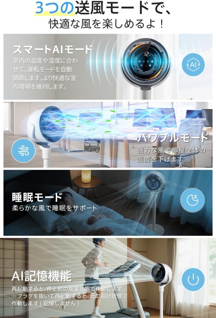 この商品のすごいところは、AI機能がついていて、部屋の温度や人の動きを感知して、風の強さを自動で調整してくれること。