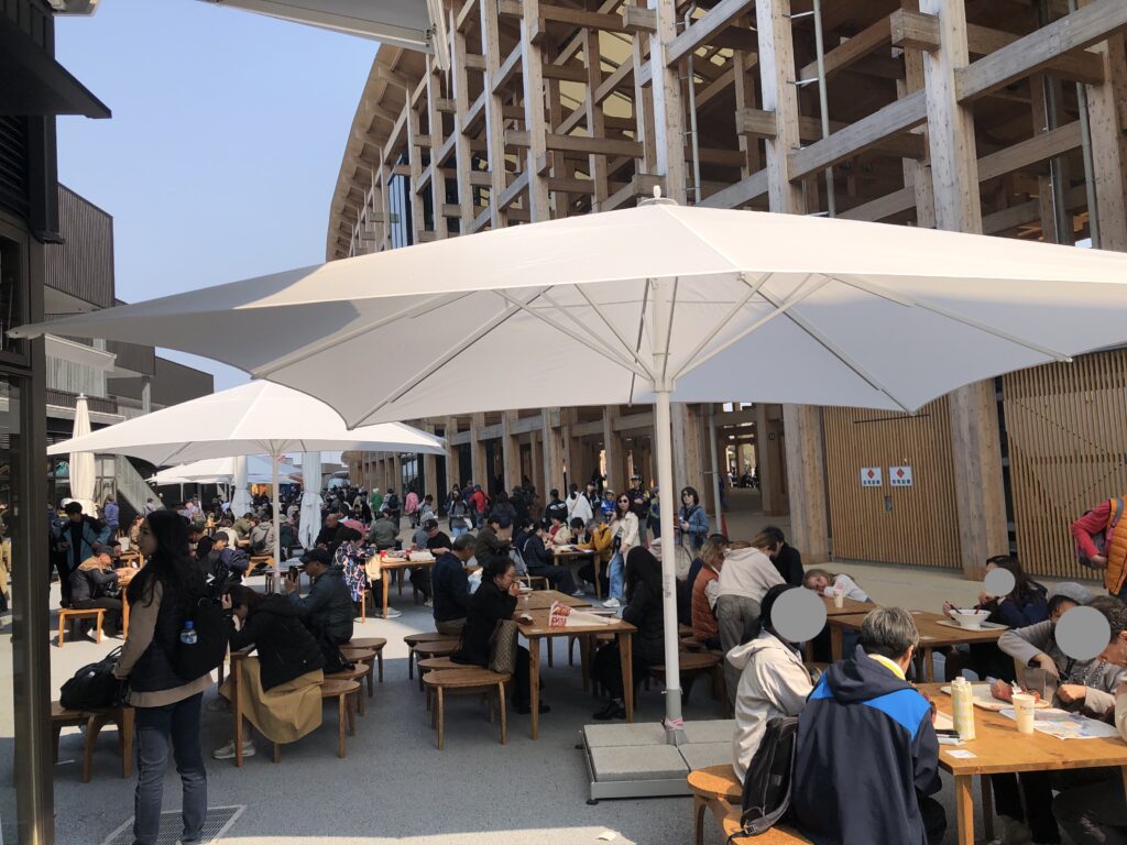日陰が少ない、という意見もありましたが、たしかに場所によっては直射日光を浴びるエリアもあります。でも、帽子や日傘を持参すれば十分しのげるレベルで、多くの大パラソルが設置され、ところどころにミストや冷風が出る涼感スポットもありました。今後さらに対策が進む可能性もあるようです。