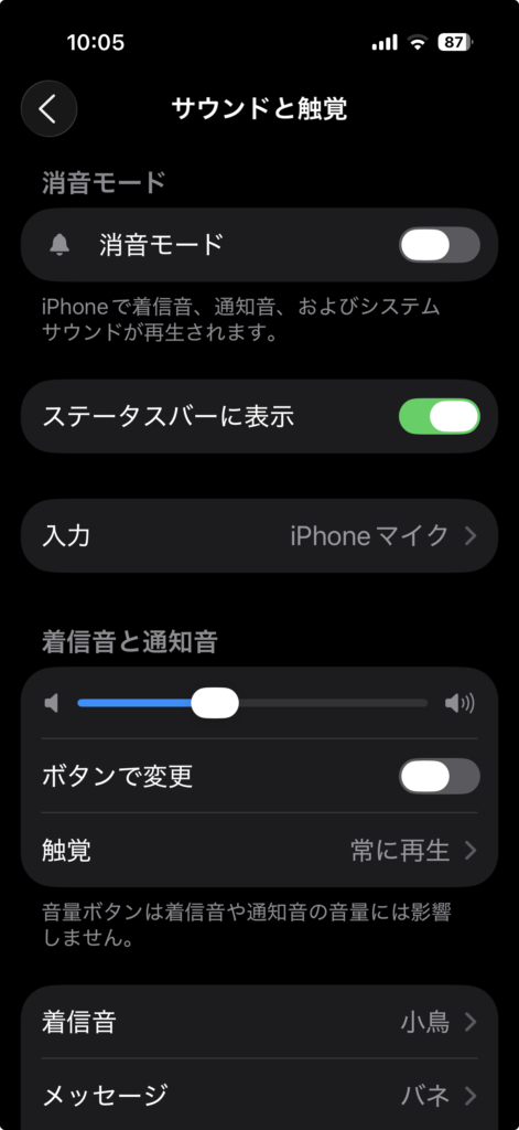 ここで、iPhone全体の音や振動に関する設定ができます。