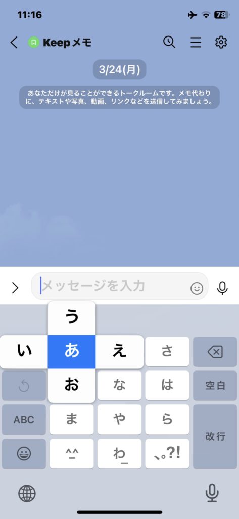 指で「あ」を長押しすると、左 → い ・上 → う ・右 → え ・下 → お、の文字が現れます。指を離す方向で、文字が決まります。