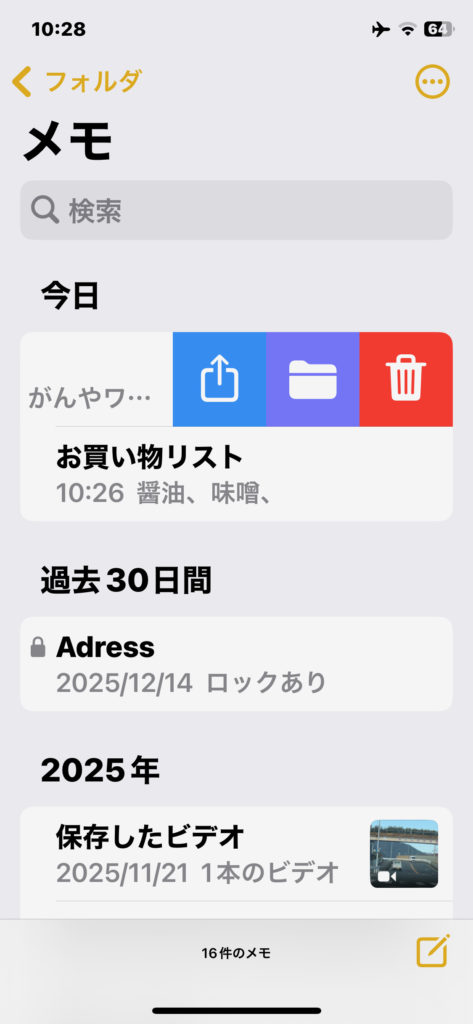 - 消したいメモを左に指でスーッと動かす