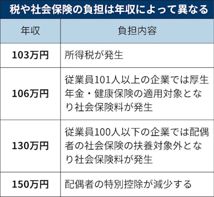「103万円の壁」で所得税、101人以上の企業の場合は「106万円の壁」で社会保険料がかかる。その対象でない場合も「130万円の壁」で配偶者の年金扶養から外れ、社会保険を払う必要がある。「150万円の壁」で配偶者特別控除が縮小する。